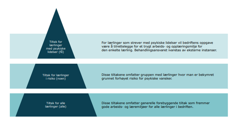 Tiltak for arbeid med psykisk helse og læring i lærebedrifter kan iverksettes på tre nivåer: